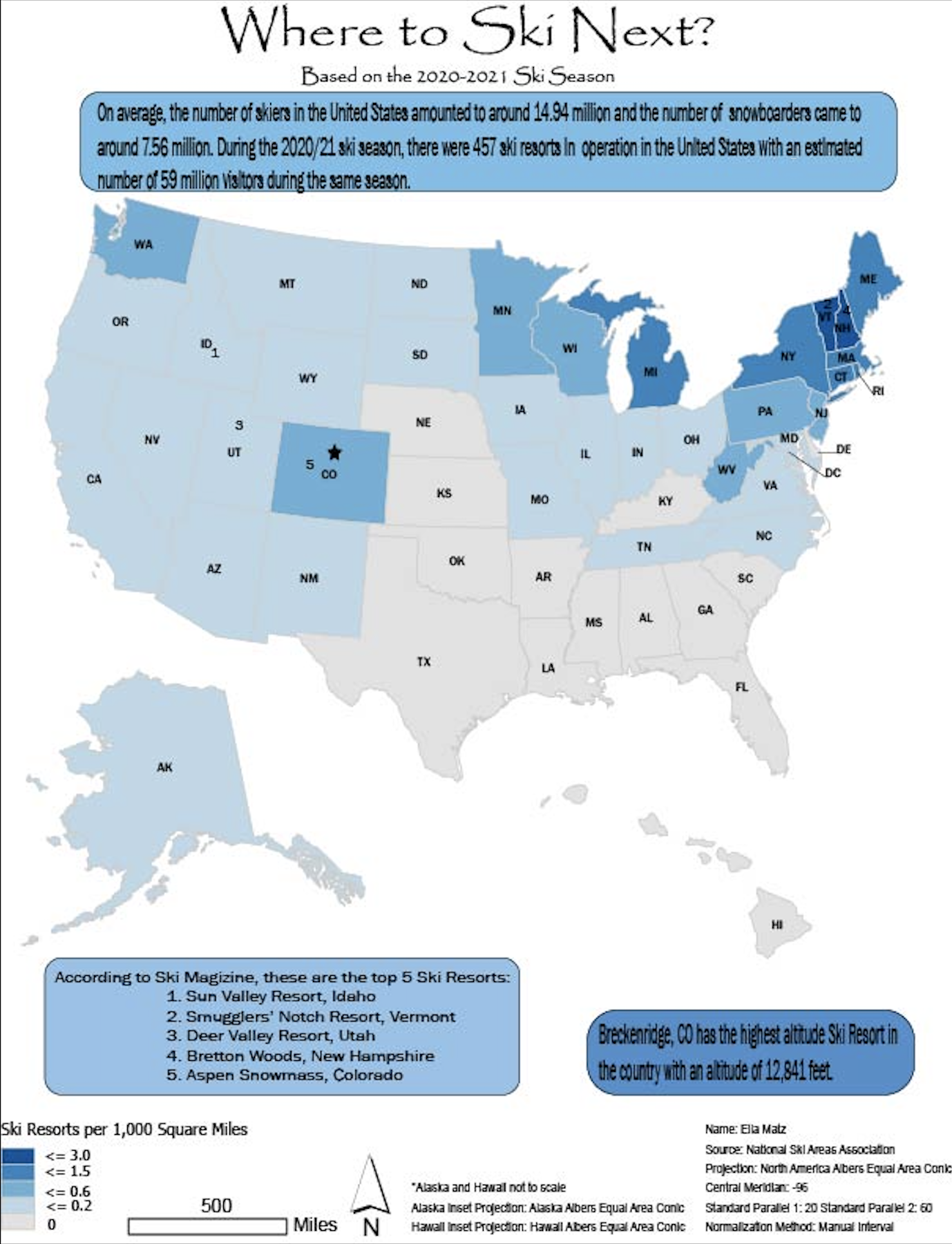 I have been skiing with my family since I was a child; therefore, I have a close personal connection to this map. This thematic map highlights the distribution of ski resorts across the United States based on data from the 2020–2021 ski season. Using a choropleth design, the map visualizes ski resorts per 1,000 square miles, which offers a clear view of density per state. A concise legend and annotations spotlight key statistics. These statisics include top rated ski resorts and noteworthy resorts like Breckenridge, CO, the highest-altitude resort in the country.