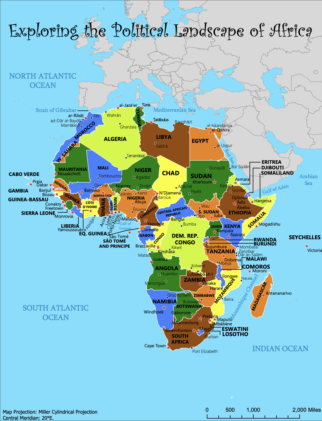 This map presents a comprehensive view of Africa's political geography, emphasizing country boundaries, capital cities, and major cities. The clear, legible typography ensures that all place names, from capital cities to regional hubs, are easy to read and distinguish. In this design, I tried to utilize thoughtful font choices and typographic hierarchy to highlight key locations and water while maintaining an uncluttered layout. The combination of vibrant tones creates a visually appealing and functional representation of the continent's diverse political regions.